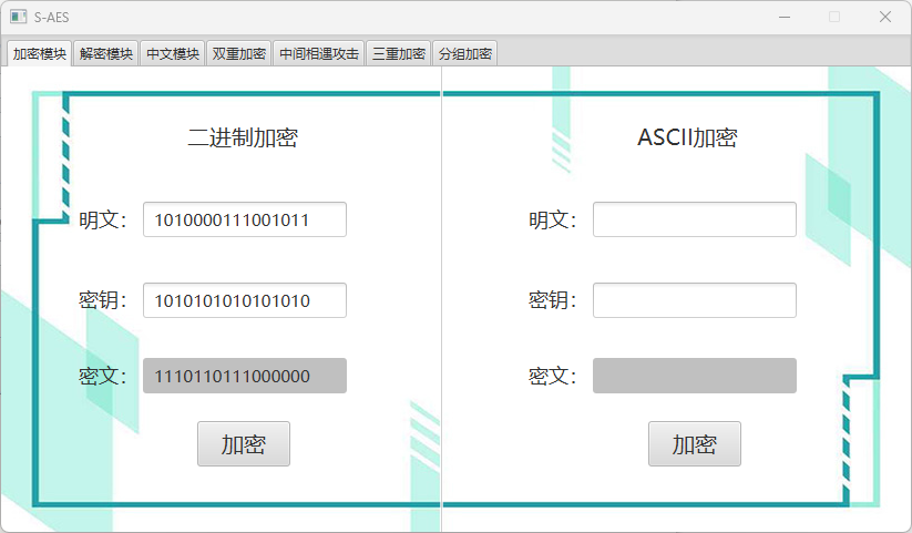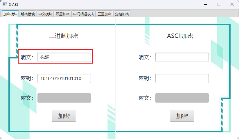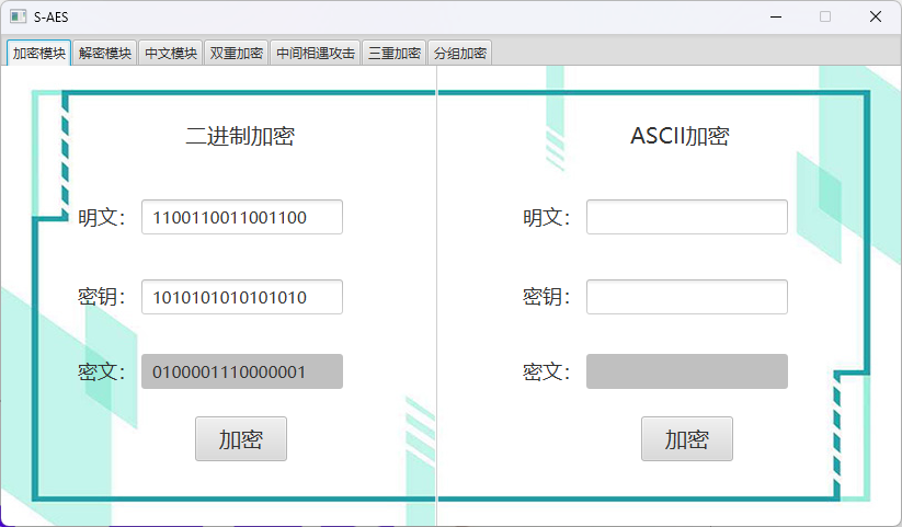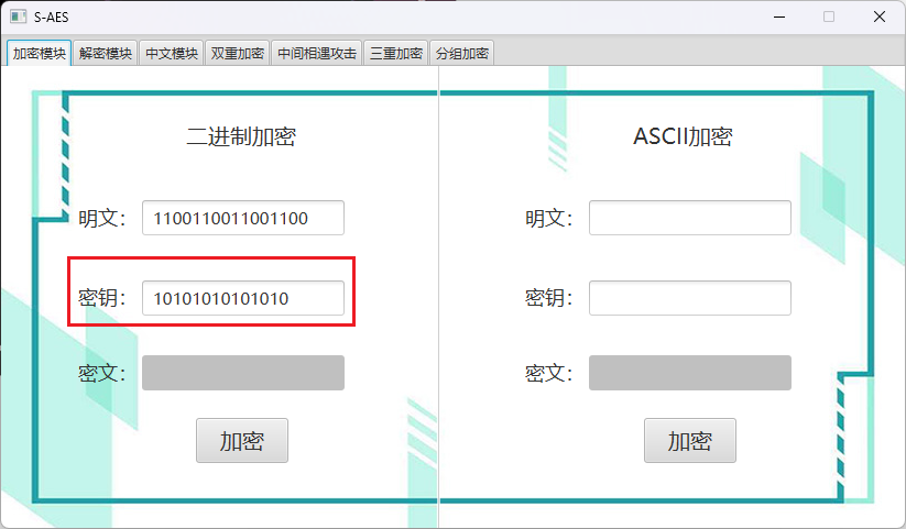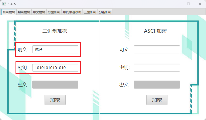 对于S-AES算法的基础实现,本系统提供纯二进制加密解密功能、ASCⅡ编码字符串加密解密功能和中文加密解密功能,在用户交互界面左上角可以选择。由于第一关为基础测试,因此仅展示使用纯二进制数字进行加密解密的功能。