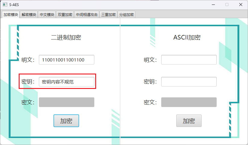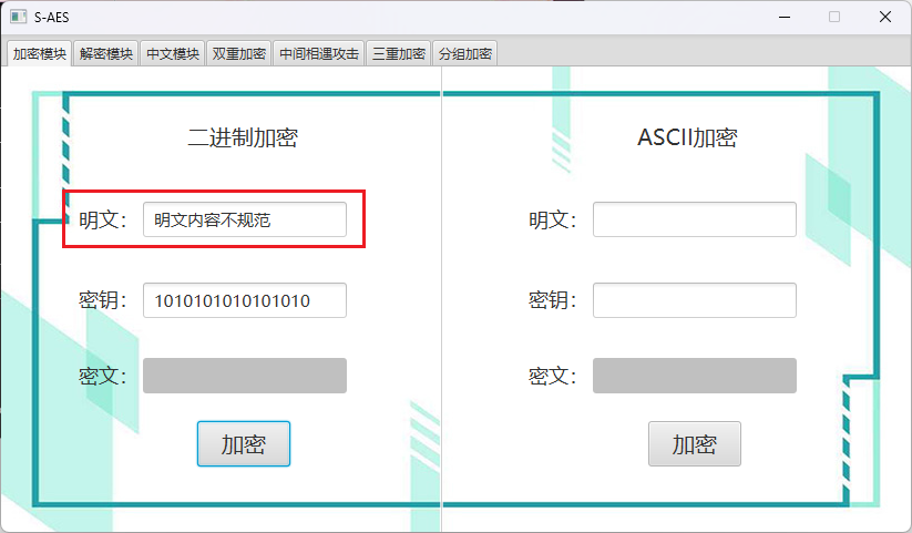 ① 当加密时输入明文不符合长度要求时(解密时同理);