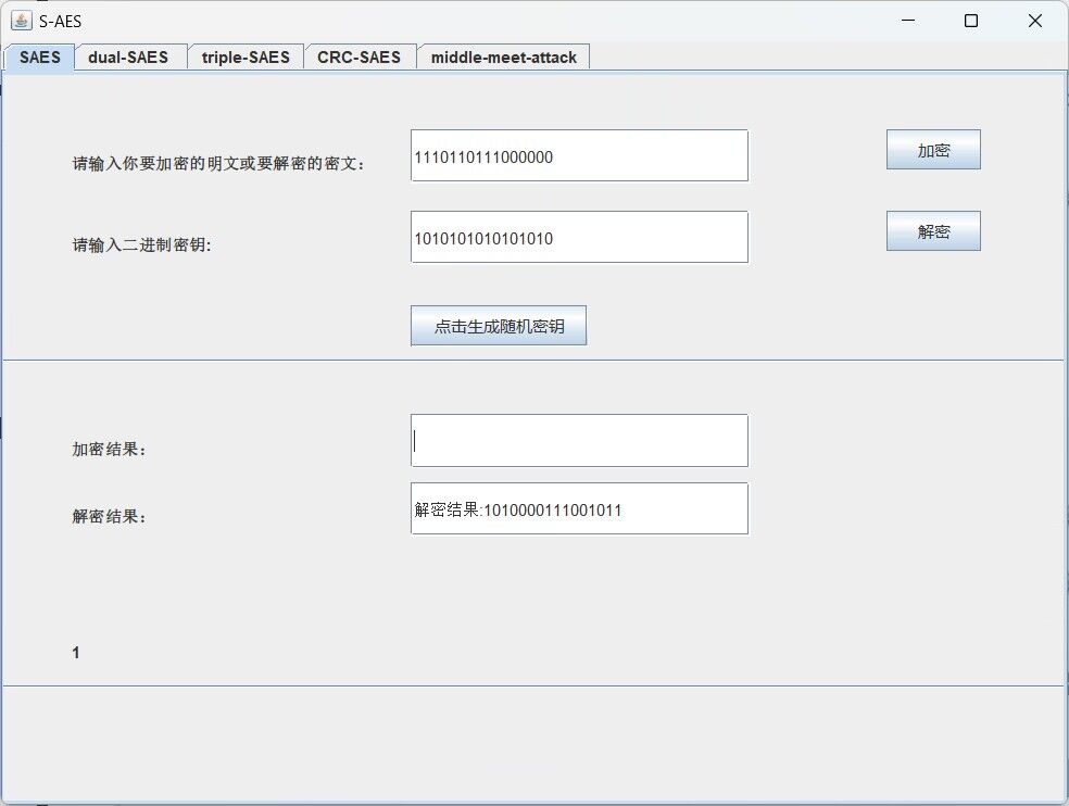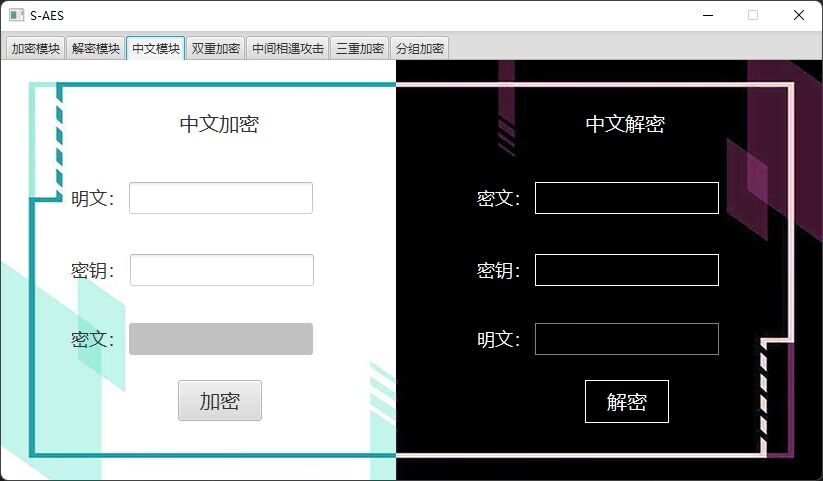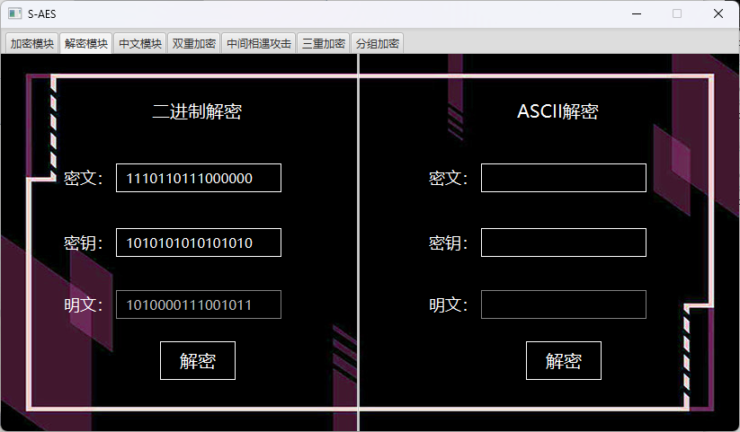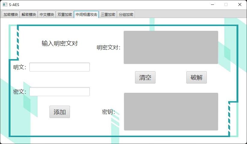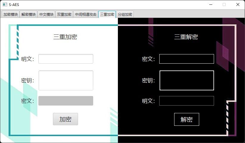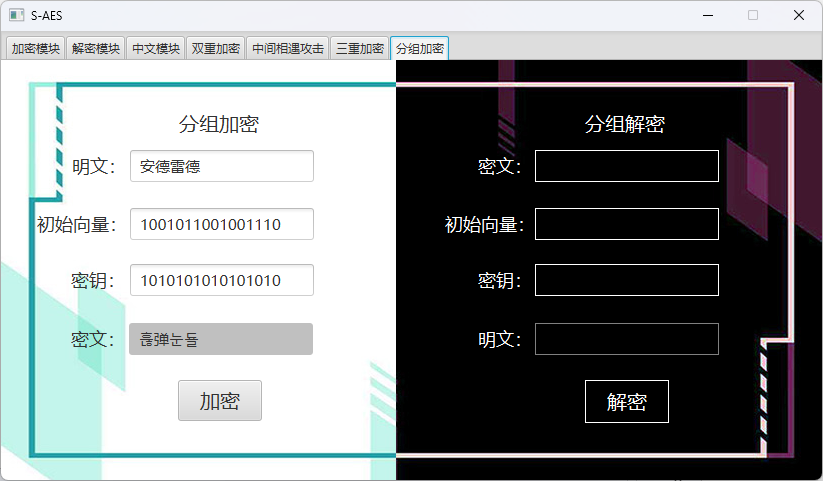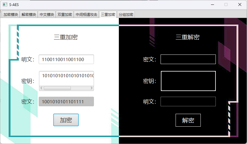 题目: 根据S-AES算法编写和调试程序,提供GUI解密支持用户交互。输入可以是16bit的数据和16bit的密钥,输出是16bit的密文。