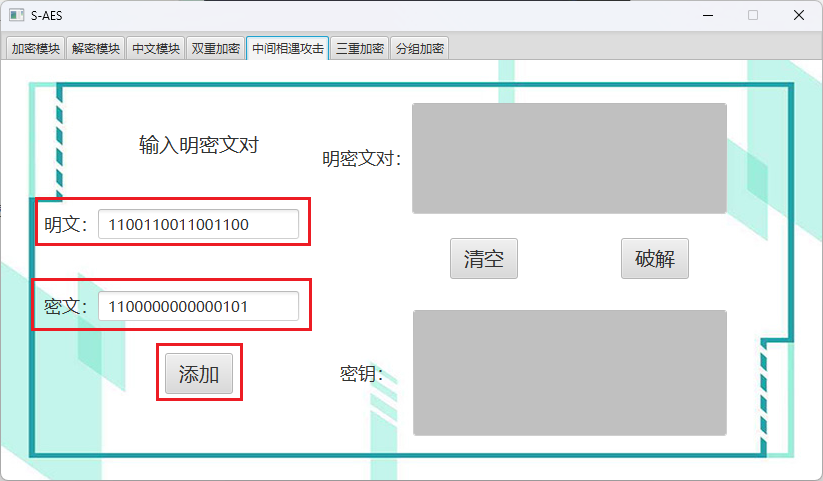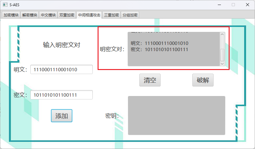 在左侧相应位置输入已知的一对明密文对后,点击添加即可添加到右侧明密文对文本域中;