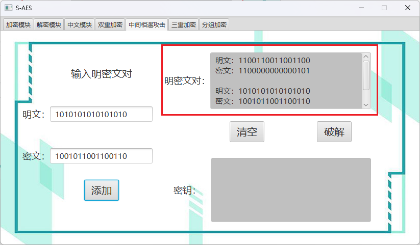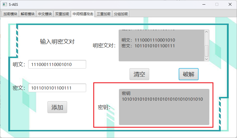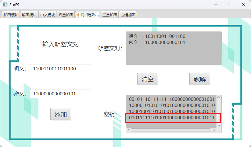点击“破解”按钮即可开始中间相遇攻击破解可能的密钥,由于单对明密文对可以破解出的可能的密钥数量过多,所以仅展示其中一部分(十个),推荐输入两对及以上明密文对,方便精准找到密钥;