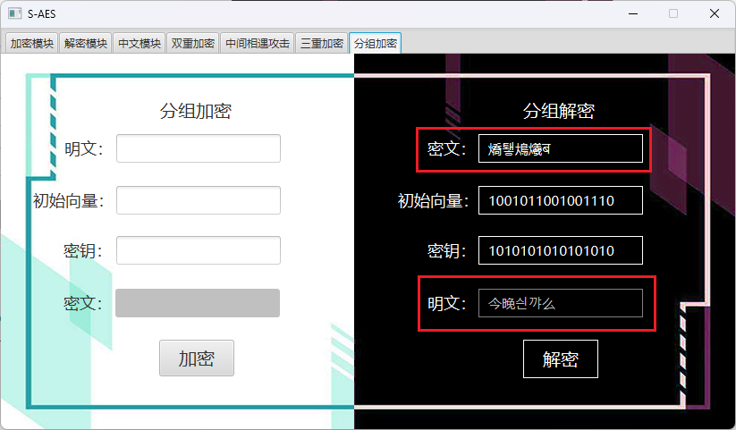 题目: 基于S-AES算法,使用密码分组链(CBC)模式对较长的明文消息进行加密。注意初始向量(16 bits) 的生成,并需要加解密双方共享。在CBC模式下进行加密,并尝试对密文分组进行替换或修改,然后进行解密,请对比篡改密文前后的解密结果。