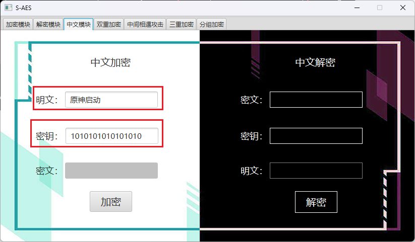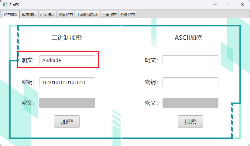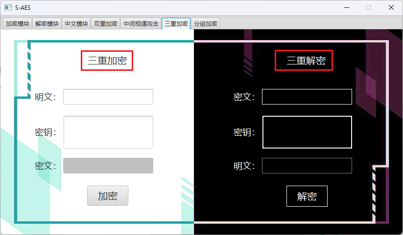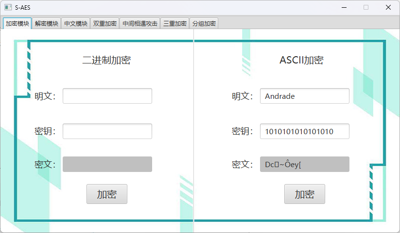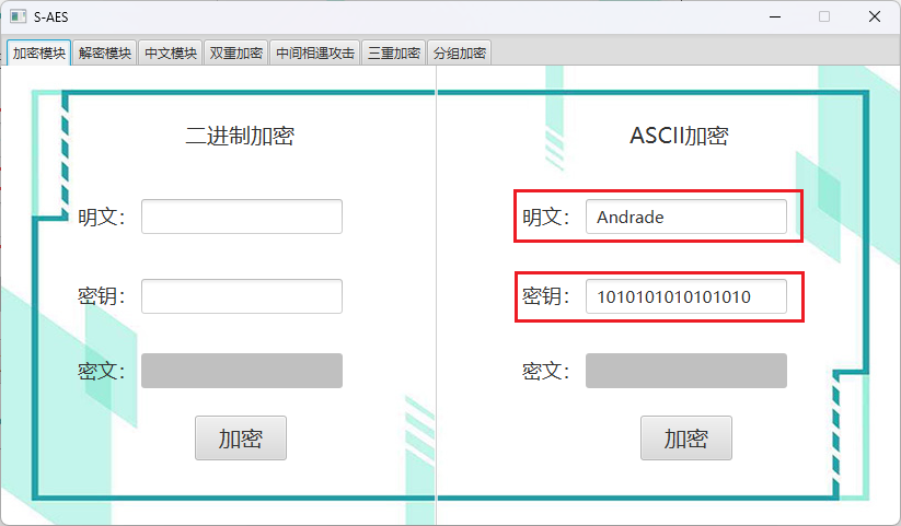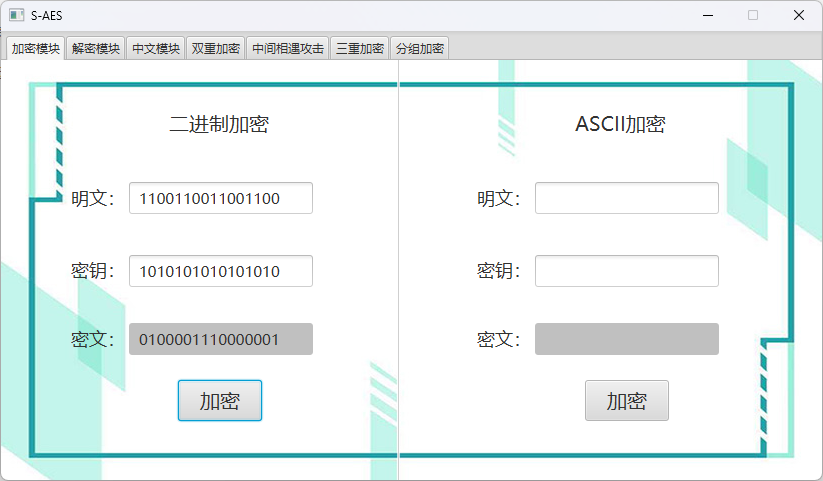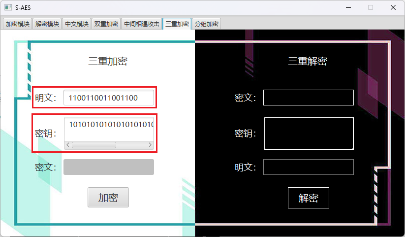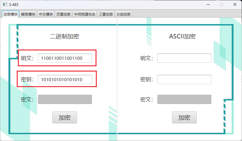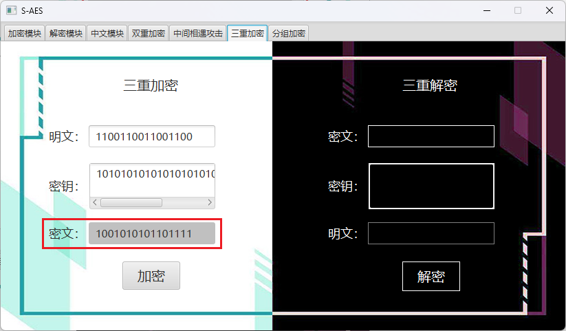 ④ 实例演示:通过示例演示来展示程序的实际运行,以帮助您更好地理解S-AES加解密和利用多重加密、分组加密工作模式实际工作的过程;