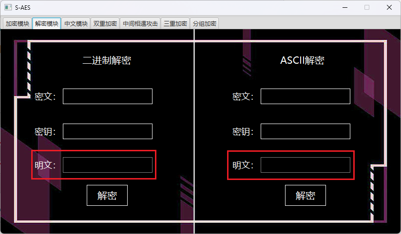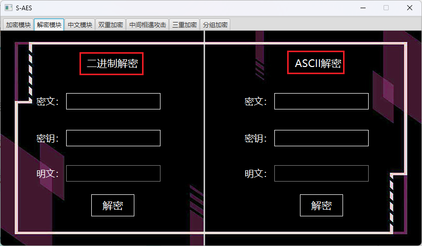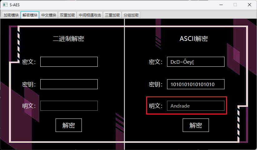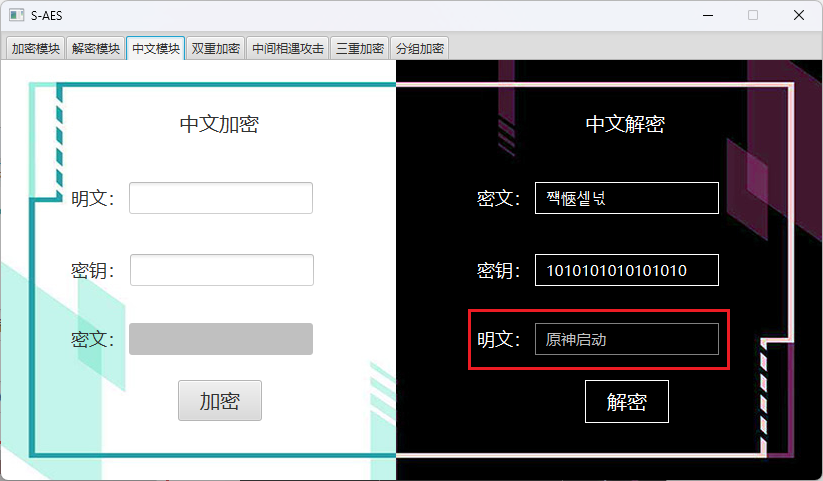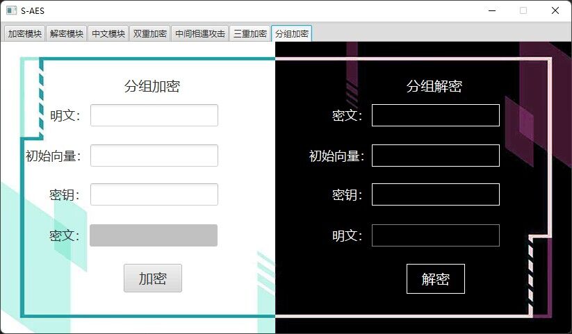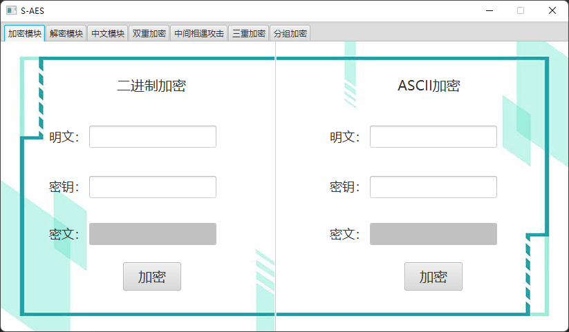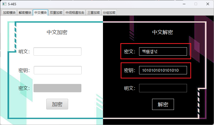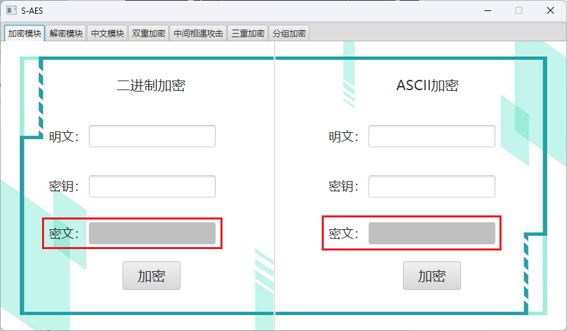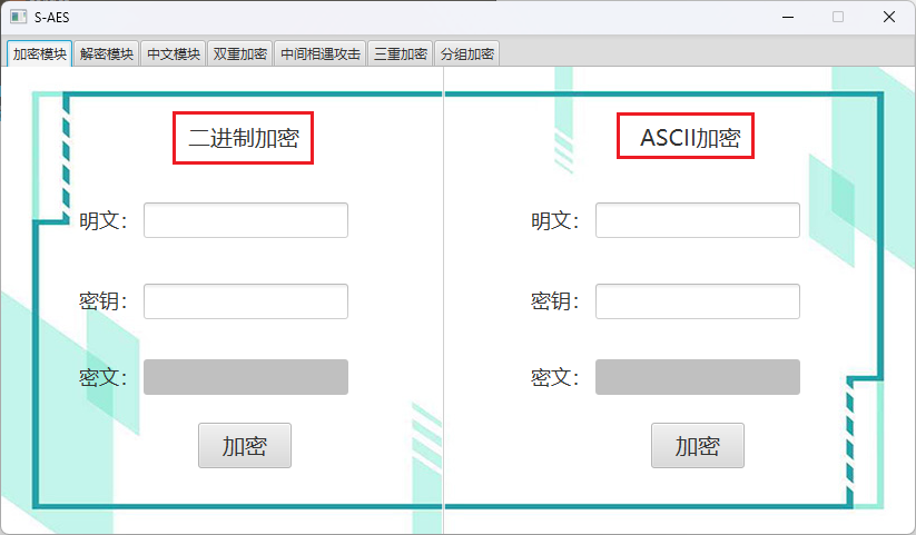 ④ 实例演示:通过示例演示来展示程序的实际运行,以帮助您更好地理解S-AES加解密和利用多重加密、分组加密工作模式实际工作的过程;