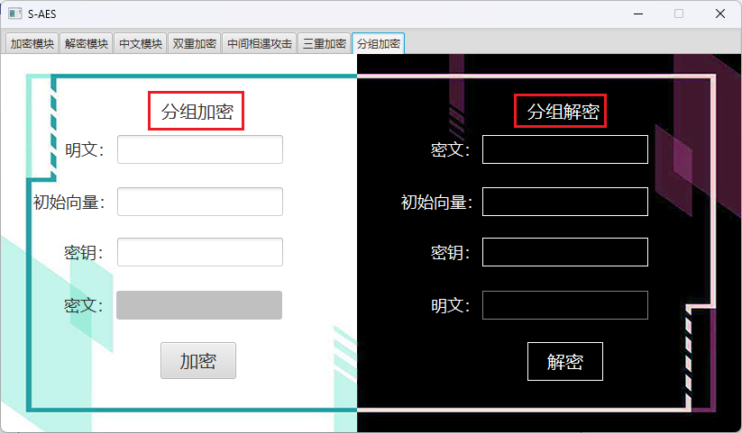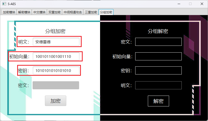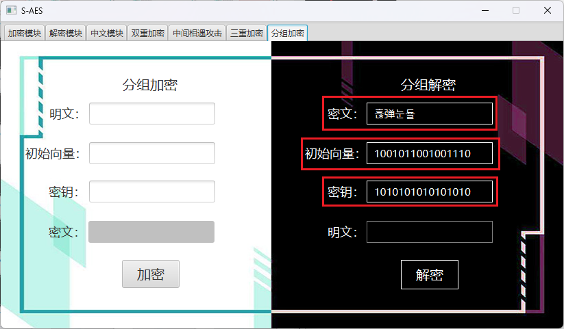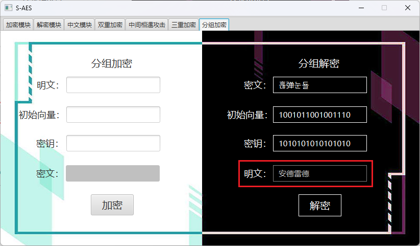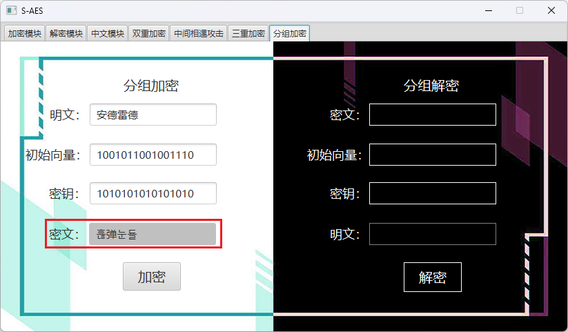 在该界面,可以输入16位二进制明文/密文、16位二进制初始向量、16位二进制密钥,点击“加密”/“解密”按钮启动分组加密工作模式进行加密解密操作,所得16位二进制密文/明文在最下方“结果”框中输出,需要注意的是,最下方的“结果”框中内容不允许用户修改,仅供浏览。