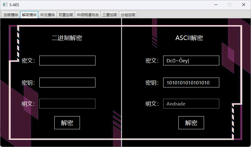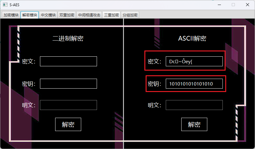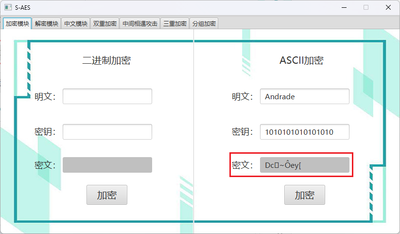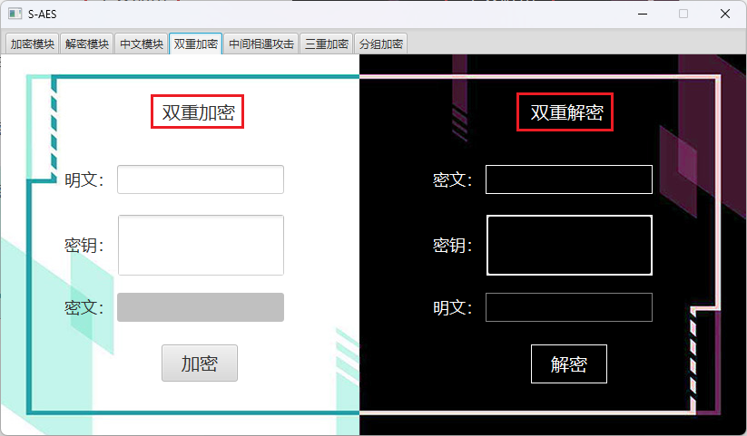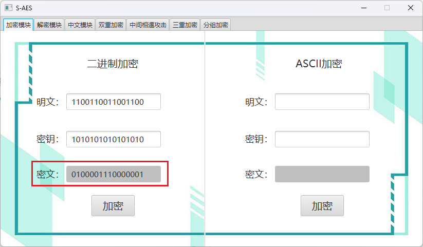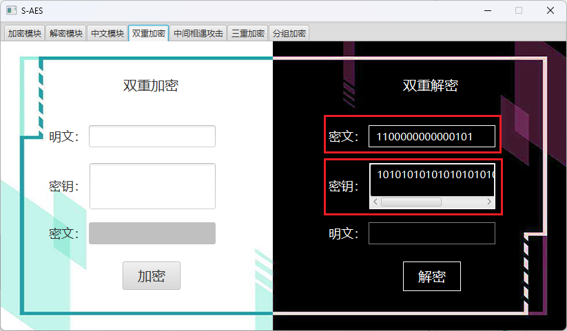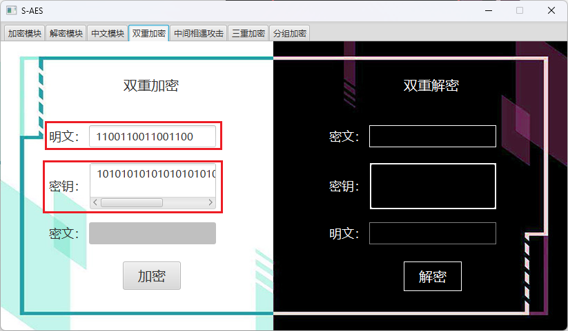 在该界面可以输入16位二进制明文/密文、32位二进制密钥,进行双重加密,并在下面输出对应的密文/明文。