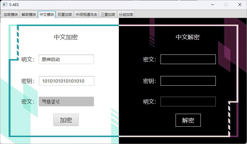 输入为中文、16bit二进制初始向量、16bit二进制密钥;