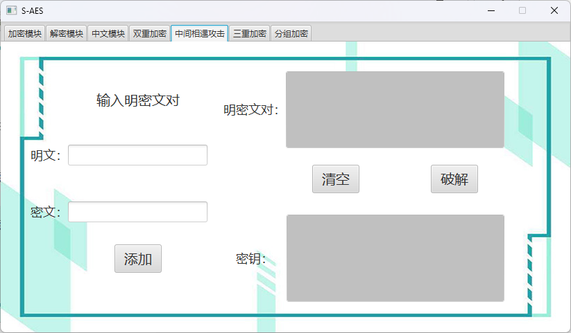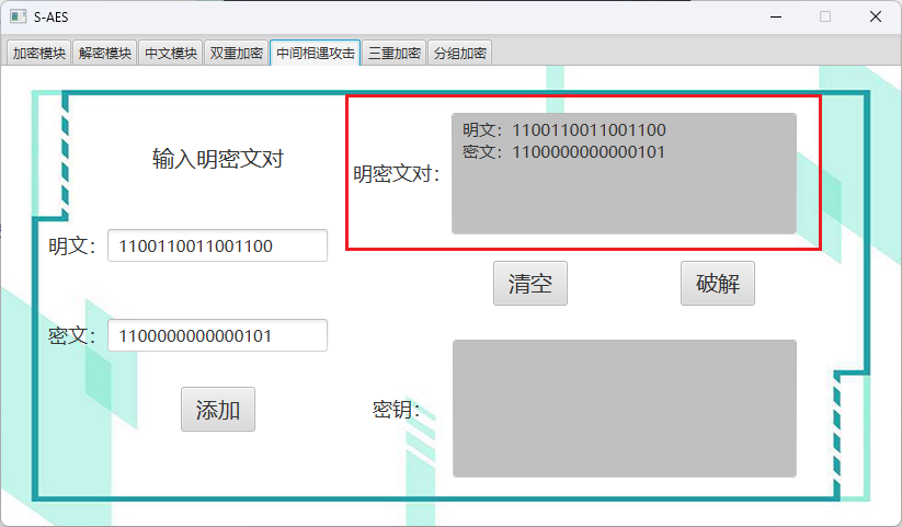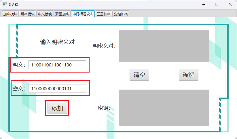 在该界面,可以在左侧依次输入均为16位二进制数的明密文对,每完成一对明密文对的输入之后,点击“添加”按钮,便会添加在右上方的文本域中,可以输入一对或多对明密文对,完成全部输入后,点击“破解”按钮便可以执行中间相遇攻击,破解所得到的可能的密钥在右下方的文本域中显现,当可能的密钥过多时,只显示前10个。