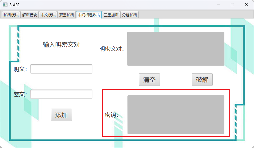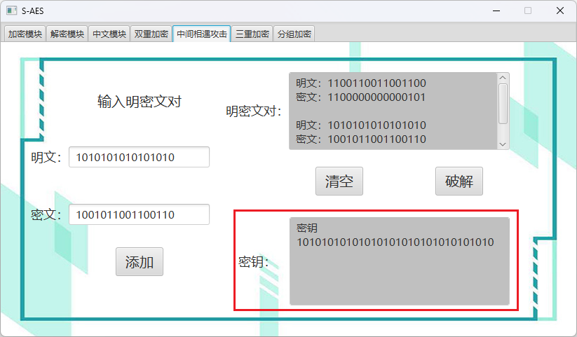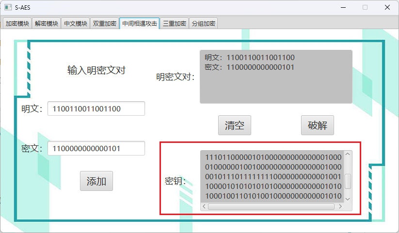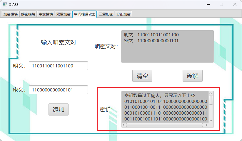 点击“破解”按钮即可开始中间相遇攻击破解可能的密钥,由于单对明密文对可以破解出的可能的密钥数量过多,所以仅展示其中一部分(十个),推荐输入两对及以上明密文对,方便精准找到密钥;