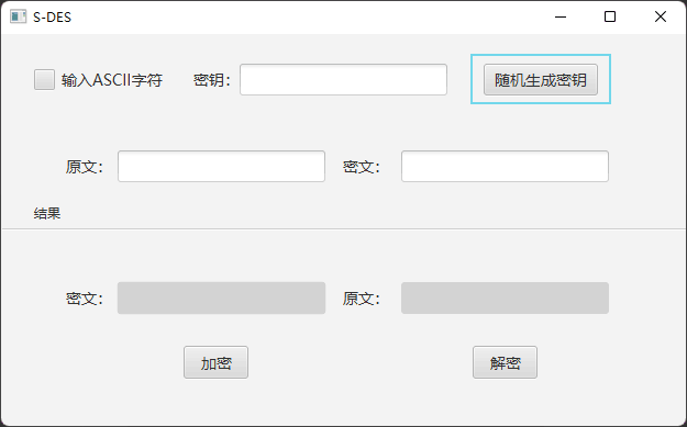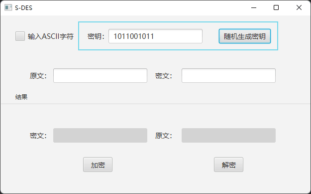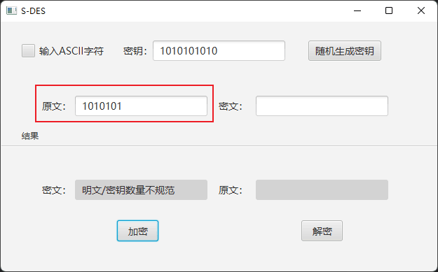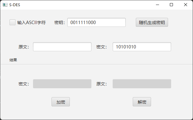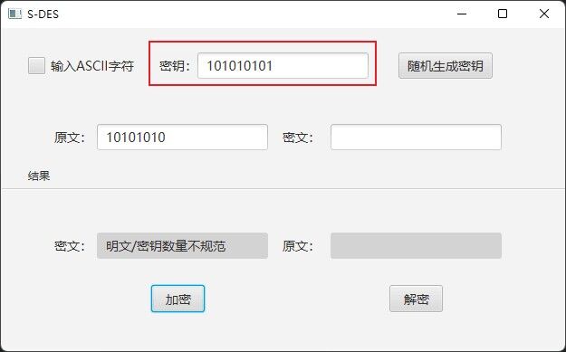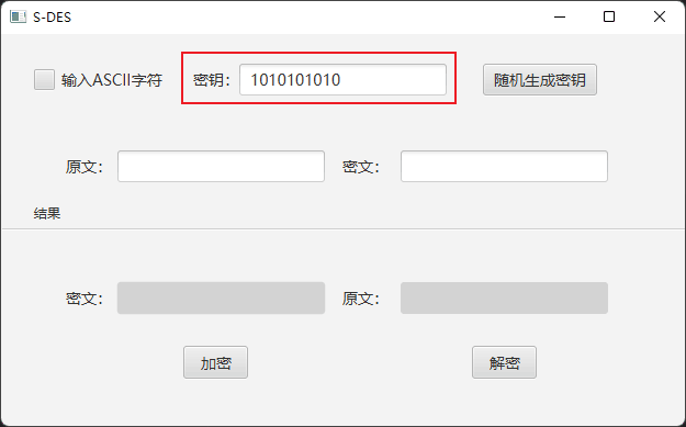输入参数为8bit二进制数或者ASCⅡ编码(分组为1byte)的字符串、10bit密钥(也可以由本系统随机生成);